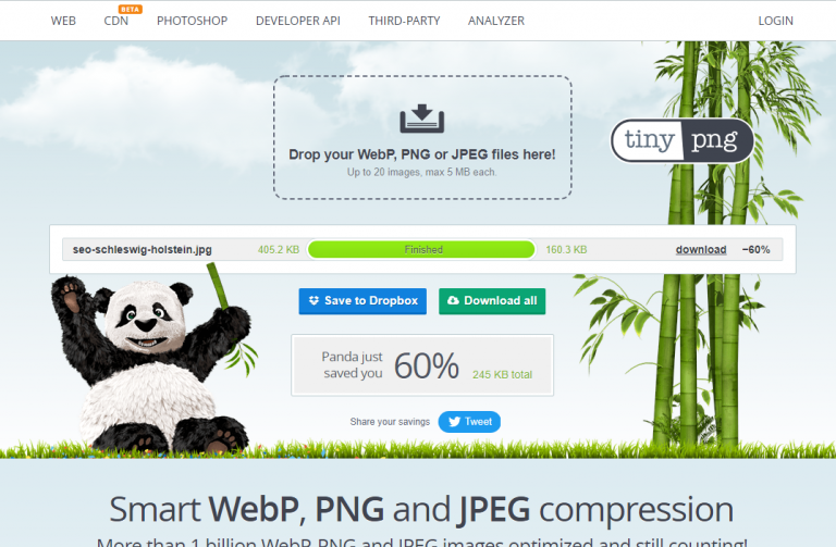 Das Programm wird das Bild nun komprimieren und Sie können es einfach wieder herunterladen. Dann tauschen Sie das Bild auf Ihrer Seite aus und schauen ob Sie einen Unterschied feststellen. In diesem Testfall konnten 60% der Dateigröße eingespart werden, so dass das Bild von 405KB auf 160KB reduziert worden ist.